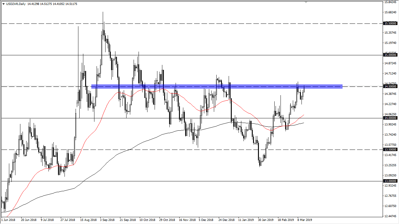 The US dollar has rallied again against the South African Rand during trading on Thursday, crashing into the 14.50 level. This is an area that I have been talking about the last couple of days, and we have now arrived that. This is an area that will cause a certain amount of selling pressure, as we have seen more than once. However, we are closing out the candle stick rather well, at the top of the range which typically suggests that we are going to go higher.