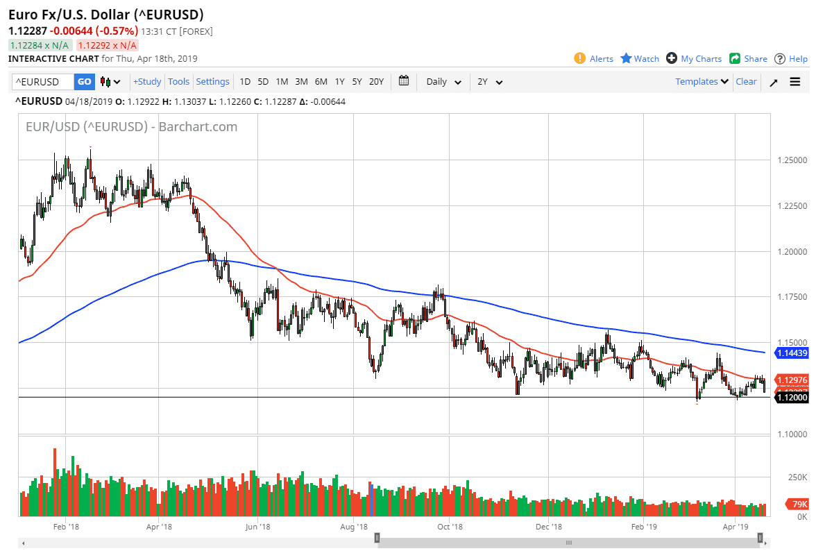 The Euro fell rather hard during the trading session on Thursday as the US dollar strength and quite considerably. That being the case, we are reaching towards the crucial 1.12 level of support, heading into the Good Friday holiday which will have most banks around the world close. With that being the case the liquidity is going to be very thin during the trading session on Friday. It won’t be until Monday that we get some type of true test of support, so it will be interesting to see how we behave. All things being equal, one would expect a bit of a bounce but it’s hard not to notice that we have been drifting lower for some time. The 50 day EMA, pictured in red, continues to be very influential, and of course the 200 day moving average is as well. To the downside, we could be looking at a move to the 1.10 level if we do in fact break down.