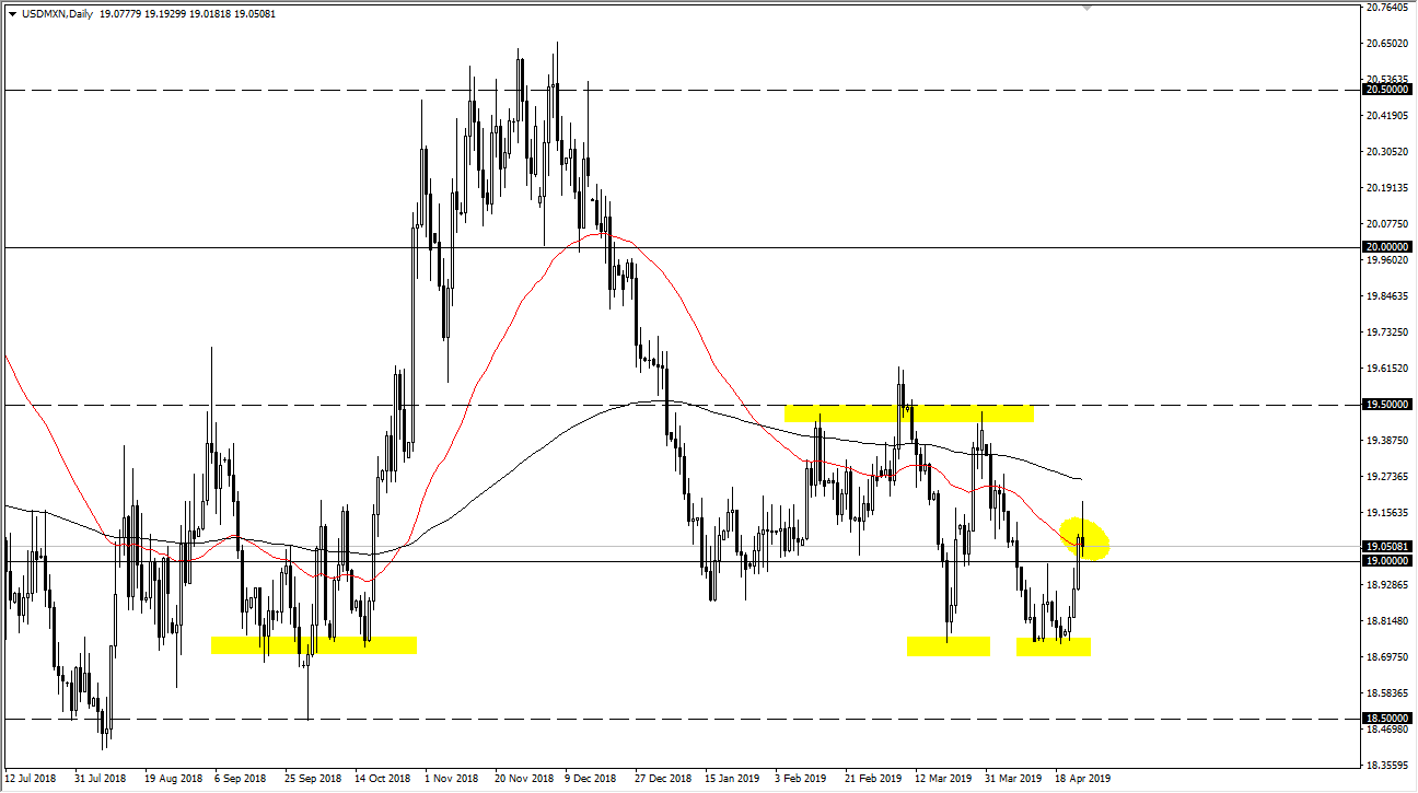 A break down below there opens up the door to the 18.50 pesos level, perhaps even lower than that. Ultimately, if we did break higher, and perhaps above the 200 day EMA, then it would show extreme US dollar strength. I anticipate that if you were to see that here, it would probably coincide quite a bit of US dollar strength around the world against other currencies, not just the Mexican peso.
