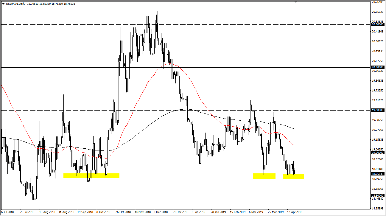 Looking at the chart I see the 18.75 pesos level as offering short-term support, but quite frankly it looks very likely to give way and let the market roll over. We have recently seen the market try to break above the 19 pesos level only to spike, form a shooting star, and then roll over again. By doing so, it looks very likely to continue the downward momentum, and I believe that the initial target will be the 18.50 pesos level below which has been important in the past. I would be a buyer unless we form some type of significant bounce or supportive candle in that area or managed to turn around and break above the 19 pesos level, which would show a bit of strength. Currently, I believe that this market will continue the momentum lower.