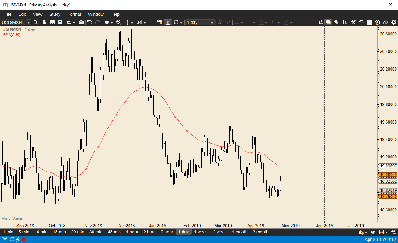 The US dollar initially rallied against the Mexican peso during trading on Tuesday but continues to show a bit of resistance at the 19 pesos level. This large, round, psychologically and structurally important number is starting to carve out a bit of a trading range currently. With that, the market looks as if it is trying to decide whether or not it can break down, or if it’s going to explode higher. It’s interesting to watch this, because the US dollar has shown extreme strength against other currencies, but it seems to be a bit of a mixed bag. I suspect that part of what’s going on here is that the Mexican peso is highly influenced by crude oil, and of course a hunt for yield, something that is very uncommon these days.