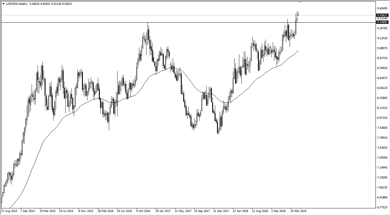 A lot of traders are a bit cautious about trading the pair, but it is part of the US Dollar Index. As such, it is technically a major pair although it only makes up about 3% of that index. Nonetheless, we have broken above the 9.45 region, and even above the 9.5 region. Pullbacks are more than likely going to continue to be looked at with suspicion, and perhaps with the idea of offering value.