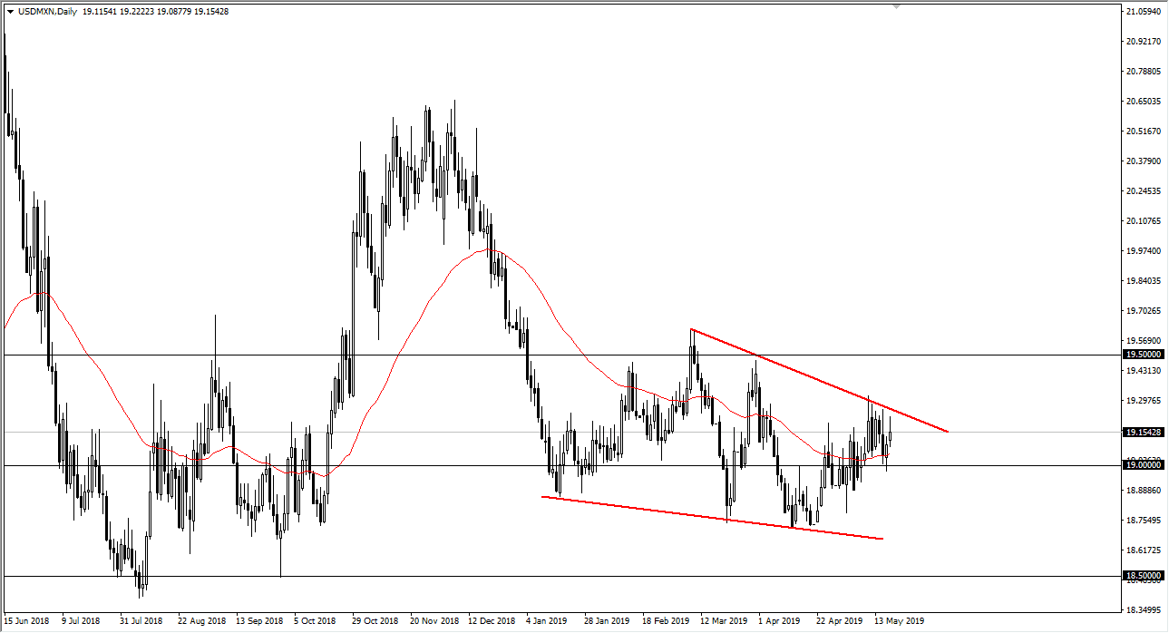 Looking at this chart, we are forming a bit of a shooting star so it looks very likely that we are going to go down to the 19 pesos level. Breaking down below that level could send this market down to the 18.75 pesos level. However, if things turn around and if we break above the downtrend line, then we could go to the 19.50 pesos level. Expect a lot of volatility, but right now it looks as if it favors the downside.