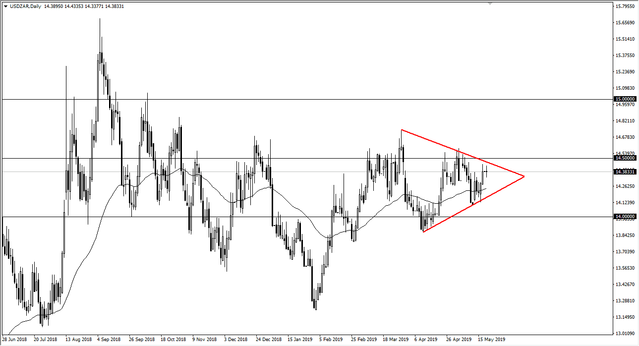 Adding more fuel to the fire of the neutral candle stick is the fact that we are in a symmetrical triangle, so of course it makes sense that the markets would be a bit back and forth as well. I think if we can break above the top of the downtrend line, then the market opens up to the 14.50 Rand level, and then possibly the 14.75 Rand level. On the other side of the coin, if we break down below the lows of the session on Monday, we will probably go looking towards the uptrend line underneath. Obviously, a breakdown below that uptrend line could send this market down to the 14 Rand level. I do believe that the 14 Rand level will be extraordinarily supportive though, so in the short term I think that’s probably what would essentially be the “floor” in the market.