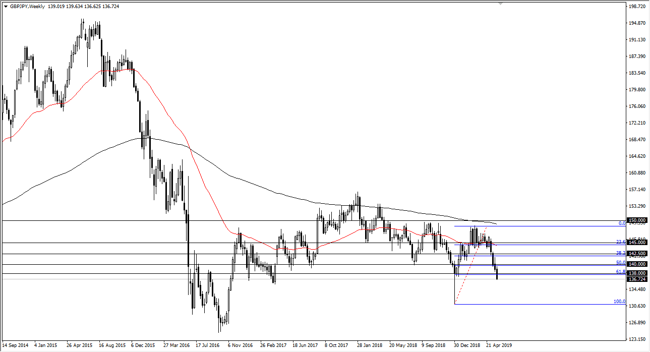 The ¥138 level has been broken, and that was an area that was so supportive in the past and of course was the 61.8% Fibonacci retracement level. That being the case, it now looks like we will probably fall rather significantly, and in my experience it’s quite common to see that a break down below the 61.8% level opens up the door to the 100% Fibonacci retracement level, wiping out the entire move higher.