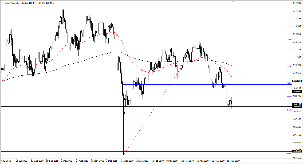 While the Federal Reserve looks very likely to ease its monetary policy, the reality is that this pair tends to move right along with risk appetite. With the stock markets rallying, this pair will probably go right along with it. However, if we were to turn around and break below the ¥107.70 level which is also the 61.8% Fibonacci retracement level, then the market probably unwinds down to the ¥105 level.