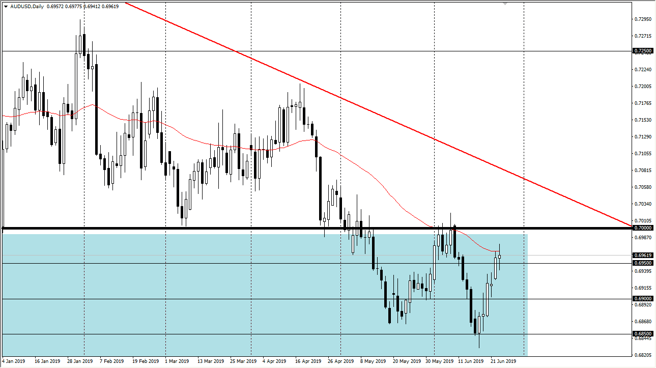The Australian dollar has rallied a bit during the trading session after going back and forth but is stalling out at the 50 day EMA, a major technical level. The 0.70 level above is massive resistance as well, and with the G 20 coming over the weekend in Osaka Japan, a lot of traders are going to be afraid heading into the weekend and therefore I suspect that the Aussie will fall as it is so highly levered to the Chinese economy. After all, the Australian dollar has high correlation to that market as Australian supply so many of the hard commodities. At this point I do like selling short-term rallies that show exhaustion as long as we can stay below the 0.7 range. We have made a “lower low” recently, and now if we make a “lower high”, it all makes sense as we grind lower. Yes, the Federal Reserve is on the sidelines when it comes to tightening monetary policy, but China is a bigger issue right now.