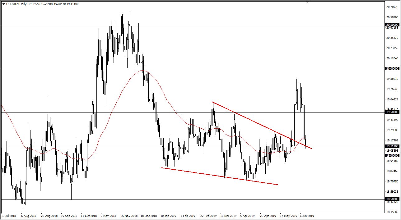 That being the case, we have an interesting set up when it comes to trading the Mexican peso, because we are just above the crucial 19 pesos level, and of course that previous downtrend line. Ultimately, this is a market that should see plenty of support in this area, so I think we will probably bounce given enough time, and it certainly looks as if we are starting to see a bit of a “risk off” attitude late in the trading session on Tuesday. If that’s going to be the case, then it makes a lot of sense that we would see the US dollar strengthen, as treasury markets are starting to turn around again.