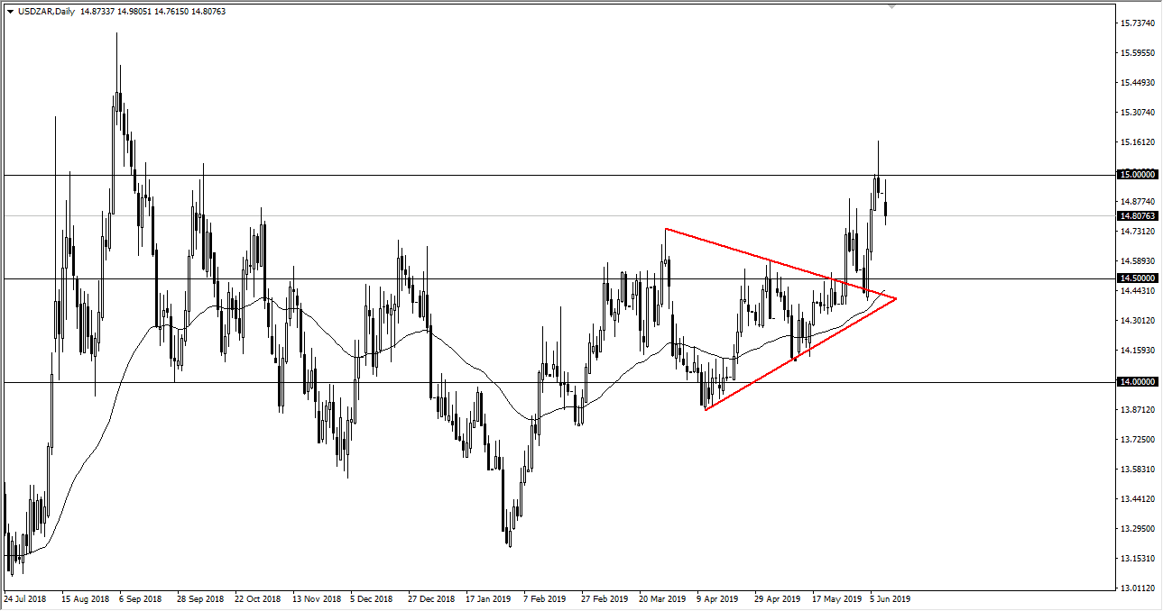 Beyond that, we have formed a shooting star for both Friday and now Monday, and this tells me that we will probably see more negativity. This makes a lot of sense because it is such a large number, but it’s also the measured move from the symmetrical triangle that we had formed and broken out of. Remember, we broke through it, pulled back to it, and then rally again. At this point, it’s very likely that we continue to go a little bit lower, perhaps reaching towards the 14.50 Rand level again.