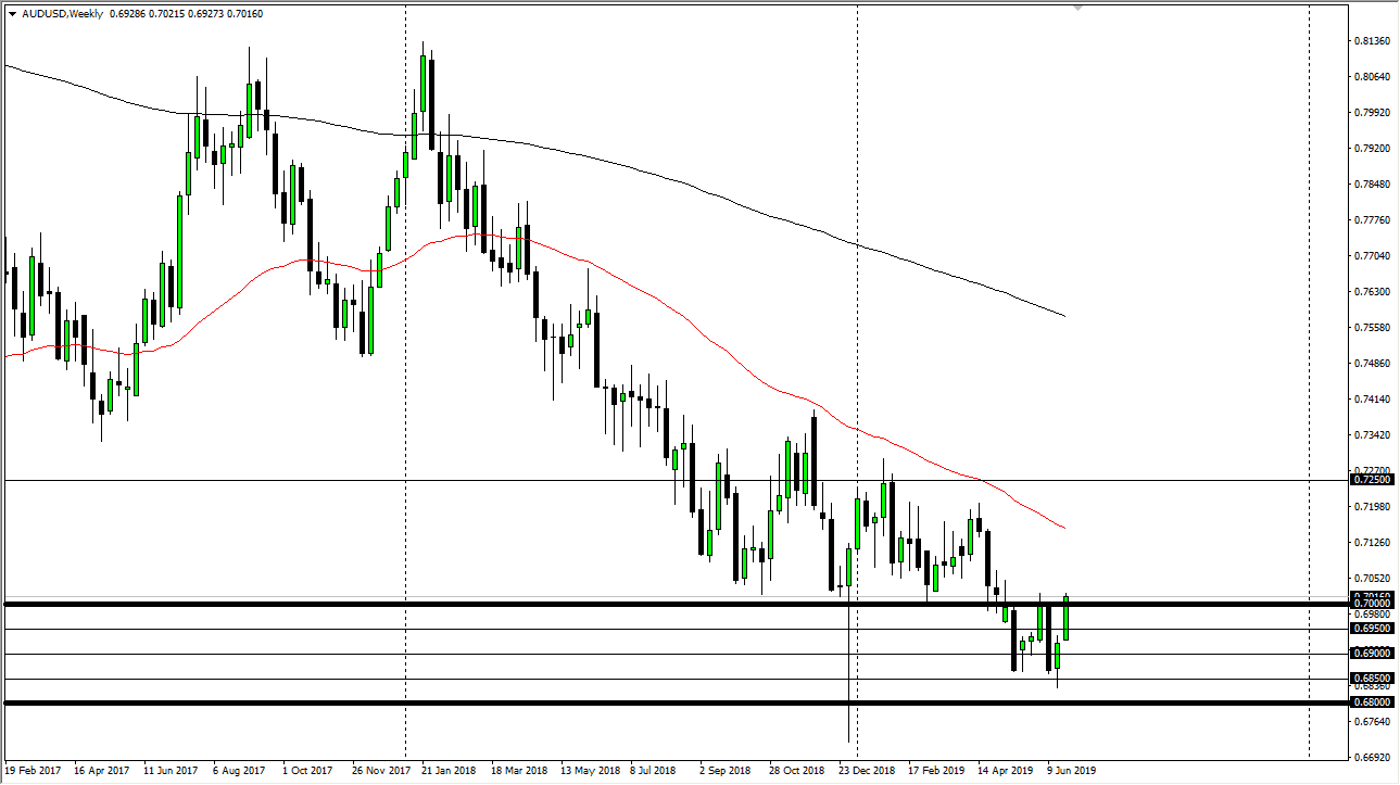 Looking at the technical analysis, we have ended up forming a large “W pattern”, and if we can break above the top of it that’s a very bullish sign. If we do get that break out, it measures for a move towards the 0.7160 area. I think at that point we would probably even continue to go to the 0.7250 level. Looking at the longer-term charts, the area that we just formed the “W pattern” in, was previously massive support band as well. That being said, if the situation between the Americans and the Chinese deteriorate, we could see a massive selloff, perhaps reaching down to the 0.68 handle and below. That being said though, and unless they really blow things up in Osaka, I think we’re going to continue to see buyers come in on short-term dips.