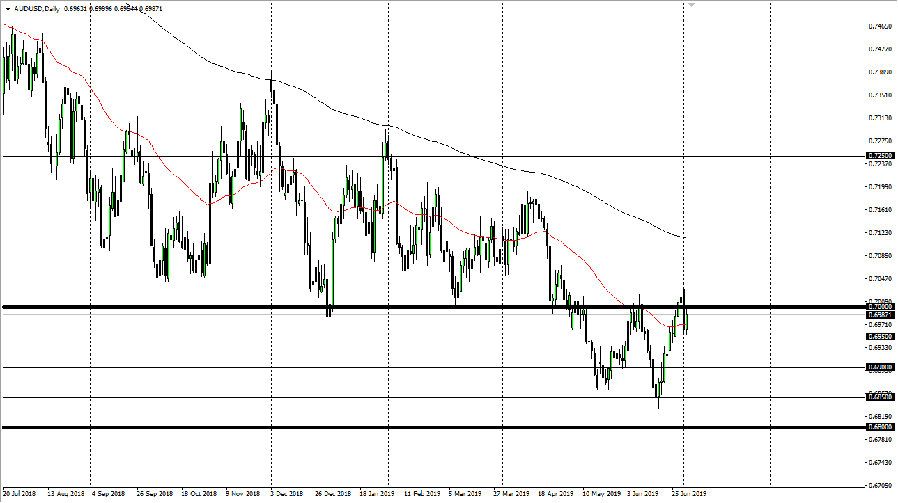 If we were to break above the 0.7060 level, then obviously that’s a bullish sign and it should open the door towards the 0.7250 level. All things being equal though, I think we will probably try to go towards the bottom again, and a bounce from time to time in these areas makes sense. I think we are trying to form some type a bottom right now, but these affairs always take quite some time, and it could be several weeks if not months before things get turned around completely. After all, the Americans and the Chinese are nowhere near getting things together right now, even if things have calmed down over the last couple of days. As we head into the July 4 holiday season in America and of course the jobs number on Friday, it is very likely that the next couple of days will be shaky at best, and iliquid at first.