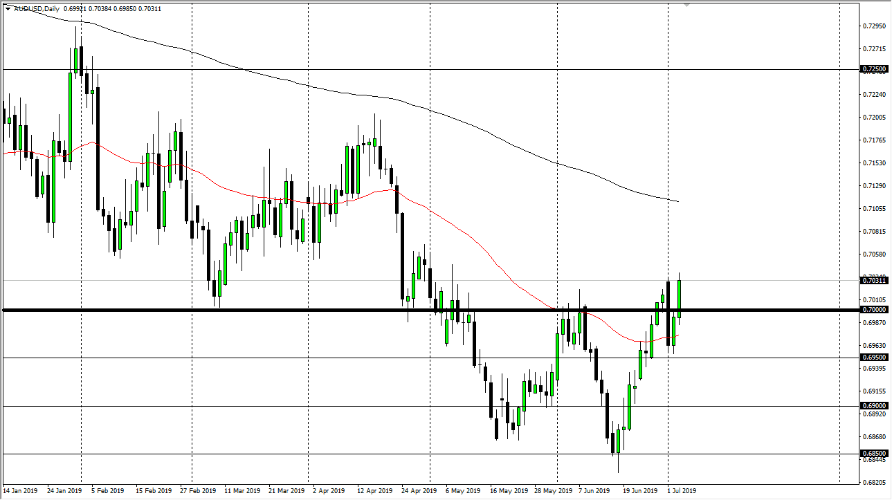 Keep in mind that the Australian dollar is sensitive to the US/China trading situation, and as a result we could have a sudden reversal at any moment. The question now is whether or not we get some type of negative headline out there that could throw a wrench into this situation. In the short term though, it looks as if we are probably going to be paying attention to the Federal Reserve cutting interest rates, so it makes sense that the US dollar may fall from here. The question now is whether or not that has enough juice to push this market to the upside.