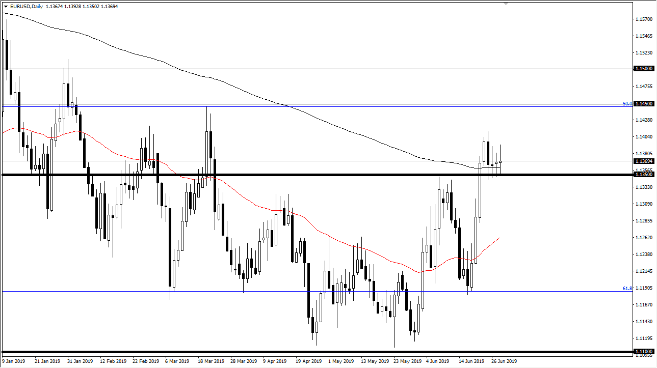 The Euro went back and forth during the trading session on Friday as we continue to dance around the 200 day EMA. At this point, the 1.1350 level underneath is offering support as well, as it was previous resistance. At this point, it looks as if the market is going to continue to try to figure out where to go next, but the fact that we broke above the 200 day EMA is a very bullish sign. We could also make an argument for a longer-term bottoming pattern and what the Federal Reserve stepping on the sidelines and now looking likely to cut interest rates, it makes sense that the Euro would gain against the US dollar.