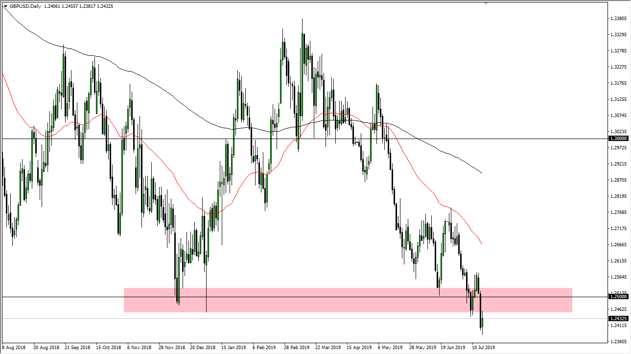 Speaking of which, the Federal Reserve is going to cut interest rates in July, and possibly again in September. If that’s going to be the case, that does weigh upon the greenback but I think that we are starting to come to terms with the idea that the British will be leaving the European Union without a deal. That probably causes the next great “flush” in this market, but when things get at the absolute worse, that’s probably when it’s time to start buying the British pound and holding on for the next decade. That being said, we are a bit ahead of ourselves.