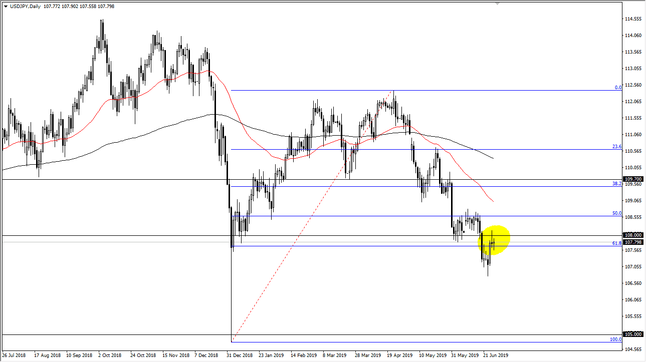 The US dollar has fallen a bit during the trading session initially on Friday only to turn around of form a bit of a hammer. Which of course is a bullish sign. However, it is preceded by a shooting star so that suggests that we are essentially going back and forth in the short term to try to figure out where we go next. With the G 20 this weekend, I suspect that we will see a significant move at the open on Monday. If we can break above the top of the shooting star from Thursday, then the market goes looking towards the ¥108.70 level. However, if we break down below the lows of the Friday session, then we are more than likely going to go looking towards the lows again and then possibly even the ¥105 level.