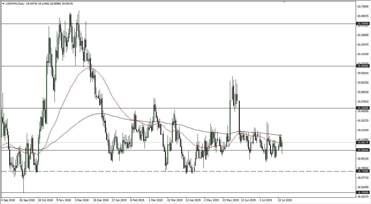 The US dollar has initially fallen during the trading session on Thursday, reaching down towards the 19 pesos level. Ultimately, this is an area that has offered a lot of support lately, so it’s only a matter time before the buyers get involved on short-term dips. After all, the US dollar is more of a safety play then the Mexican peso will ever be, and of course we have a lot of soft news when it comes to the petroleum markets. The Mexican peso is a bit sensitive to crude oil, so pay attention to that market. Currently though, the market is looking a bit sluggish to say the least.
