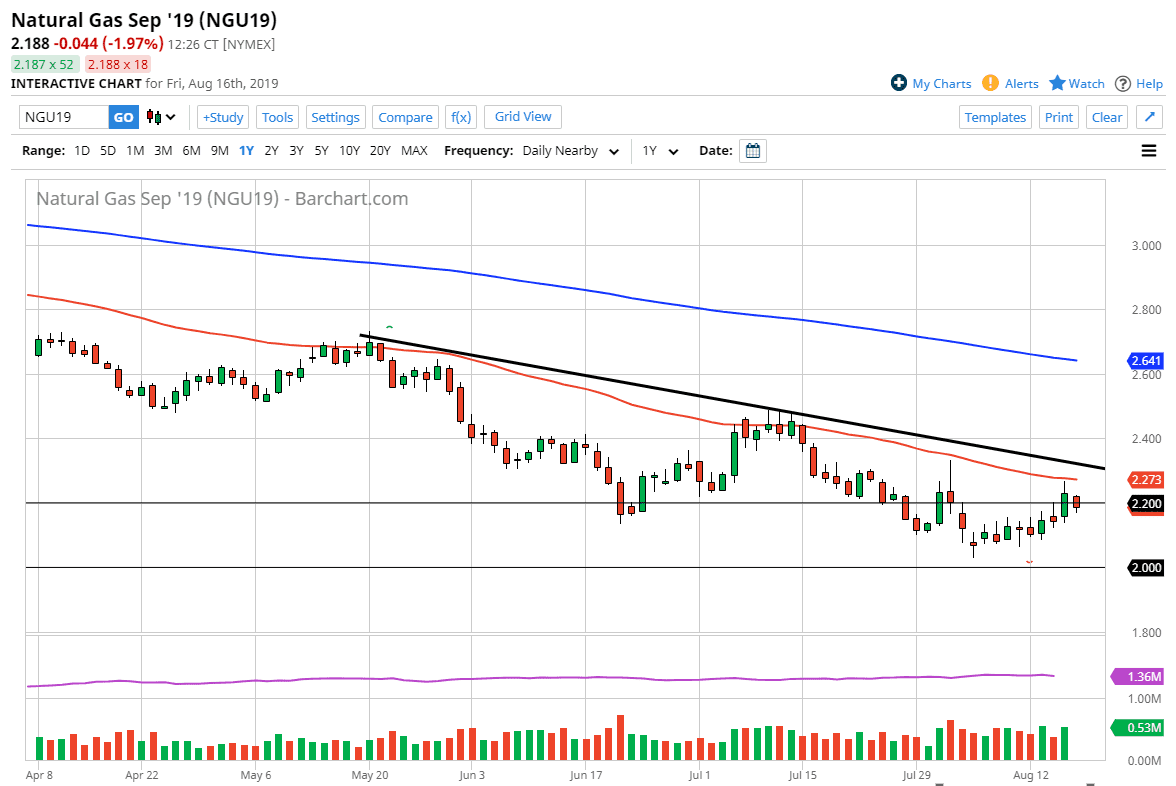 Natural gas markets fell rather steeply early on during the trading session on Friday, reaching down below the $2.20 level. By doing so it showed that the market continues to struggle to hang onto gains, although this past week has been somewhat decent. Ultimately though, when you look at the natural gas markets, it’s likely that you will continue to see sellers jump into this market and push to the downside.