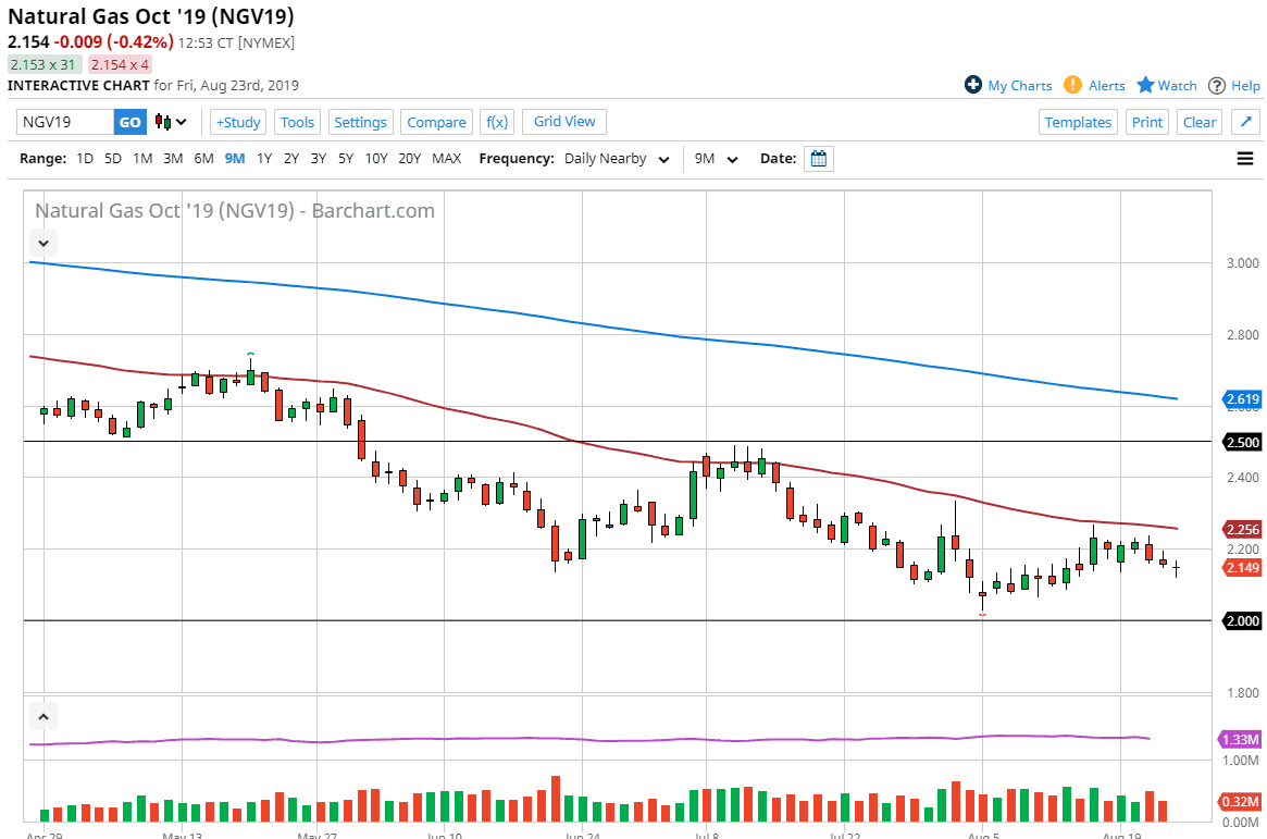 While there is only a matter time before we start trading colder months, the futures markets are currently trading in October. This isn’t exactly the most bullish month, but it is getting a little bit better. There is cold weather coming, and once that happens it’s very likely that we will continue to go higher. All things being equal, the buyers will start to be more aggressive once we start to trade colder contracts, but in the meantime, I think we continue to fade the rallies. Given enough time, the market should start to rally but I think we need to have another crack at the $2.00 level before that happens. I figure we are a couple of weeks away from starting to see buyers come back in, so in the meantime I’m looking for signs of exhaustion. The 50 day EMA will continue to be a nice barrier to bounce back from.