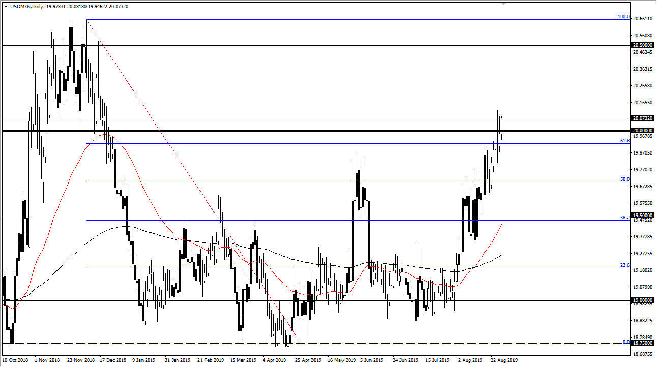 The US dollar has rallied quite significantly against the Mexican peso during trading on Wednesday, as we continue to see a rush into safety currencies. The Mexican peso is a significant emerging market currency, so you can look at this as a bit of a play on global risk appetite. The higher this market rises, the more likely we are to see a significant break down and risk assets.