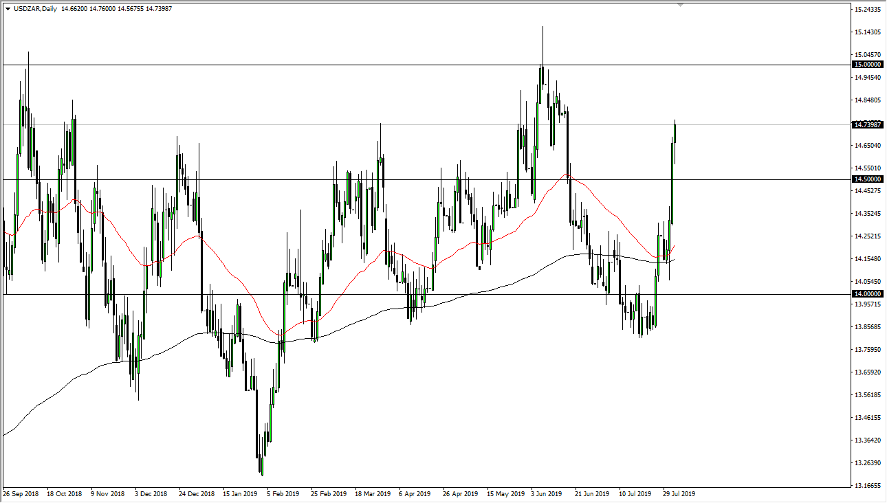 Without a doubt, one of the most important things that you need to pay attention to when trading this pair is whether or not the market is in a “risk on” or “risk off” type of attitude. As we have seen massive damage done to stock markets around the world it makes sense that the US dollar will rally against such exotic currencies of the South African Rand.