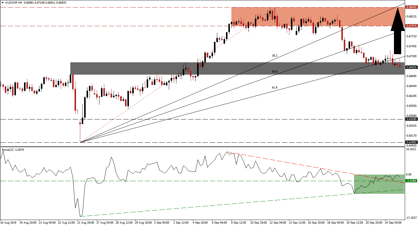 While the Force Index started to recover, price action remains inside its short-term support zone. This zone is located between 0.66727 and 0.67035 as marked by the grey rectangle in the chart. As long as the Fore Index can maintain its position above the ascending support level, the AUD/CHF is expected to be under a rise in bullish momentum. Following a move above its 61.8 Fibonacci Retracement Fan Resistance Level, the intra-day high of 0.67349 should be monitored. This level marks the most recent high before descending into its support zone and a move higher could result in new net buy order which will push price action further to the upside.T