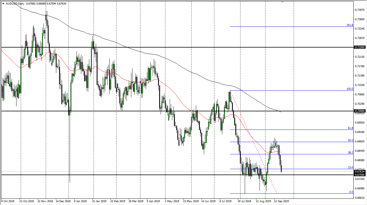 The Australian dollar initially tried to rally during the trading session on Friday, but then pulled back from the 0.68 level to fall pretty significantly. With that being the case it’s likely that we will see the market drop down towards the lows again, which is just below the 0.67 handle. This makes quite a bit of sense as the US/China trade relations have not gotten any better, and although there were low-level talks over the course of the week, it wasn’t as if something had fundamentally changed.