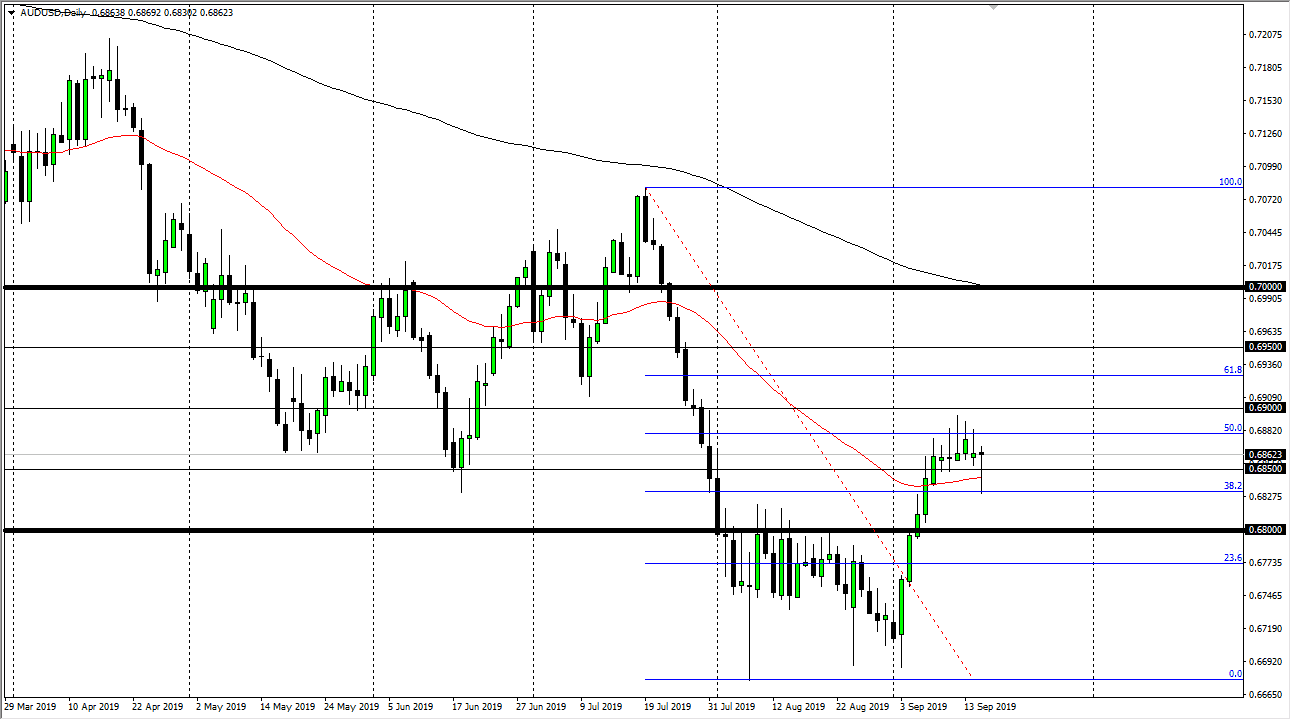 The Federal Reserve will more than likely find reason to sound dovish, but the question is exactly how dovish? If they are overly dovish, you may see a little bit of a bounce in the Australian dollar but at the end of the day it’s very difficult to imagine a scenario where the Australian dollar continues to go higher for the long term, as we have a lot of moving pieces out there that would cause issues for the Aussies. After all, they are highly levered to the US/China trade situation, and of course it’s very unlikely that the situation gets demonstrably better in the short term. Yes, the Americans and the Chinese are starting to talk to each other a little nicer, but at the end of the day the issues that they face are structural.