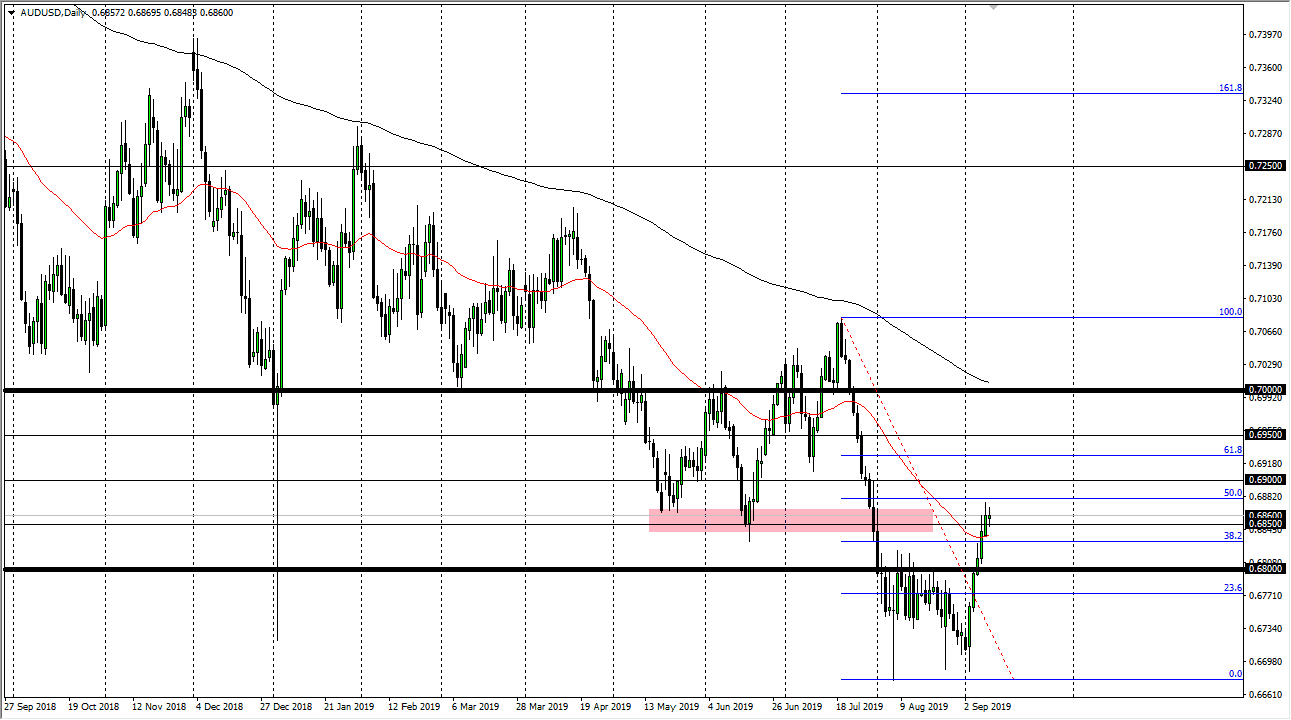 The Australian dollar went back and forth during the trading session on Tuesday, slicing around the 0.6850 level. By forming this very neutral candle stick, it’s likely that it is showing that the Australian dollar is a bit overdone at this point. In fact, the 50% Fibonacci retracement level is just above and that could cause a bit of resistance. That being said, I like the idea of selling if we can break down below the 0.6050 level, perhaps even the 50 day EMA. Remember, even though the United States and China are talking again, the reality is that we are light years away from some type of agreement. This is simply short-term traders trying to take advantage of the market momentum, and as soon as it’s obvious that nothing will come out of these meetings, the Australian dollar will roll over.