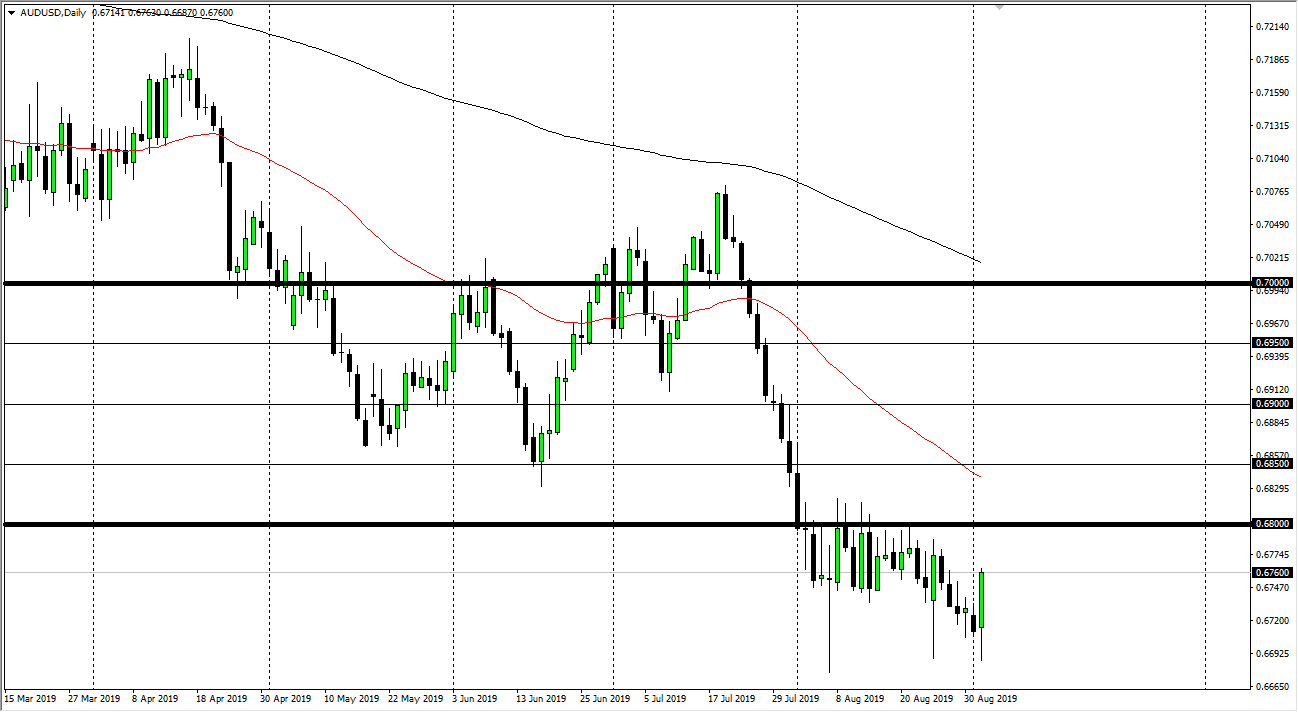 The Australian dollar is heading towards a significant amount of resistance just above, especially near the 0.68 handle, as it is an area that has caused quite a bit of selling in the past. We have seen a nice turnaround during the trading session, but we are still in a very negative downtrend, so I think it’s only a matter time before the sellers come in and push this market right back down. Beyond that, the Australian dollar is too highly levered to the Chinese economy do think that it will take off to the upside for a significant move.