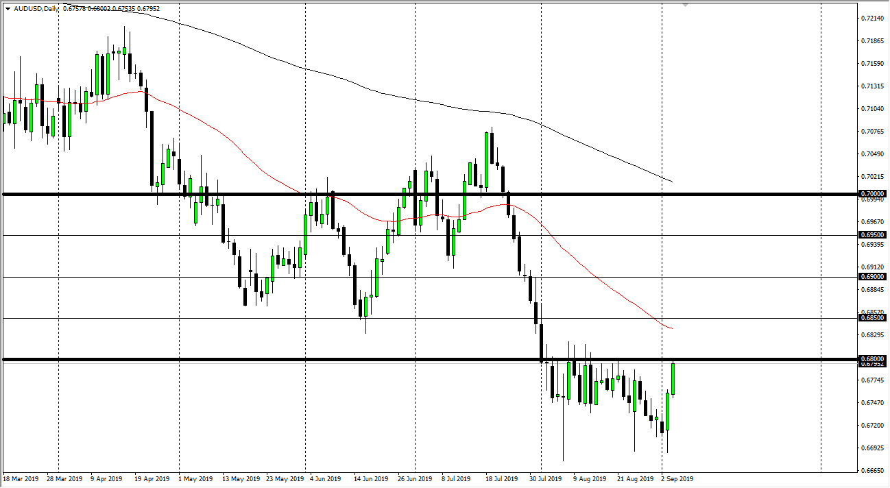 The Australian dollar has rallied quite nicely during the trading session on Wednesday, slamming into the 0.68 level, an area that should continue to offer plenty of resistance based upon recent action. The fact that we have gone straight up in the air and slammed in that level will more than likely make it easier to push back as we will probably run out of momentum. Add to the fact that the US/China trade talks aren't going any better, and then you have a perfect recipe for weaker Aussie overall.
