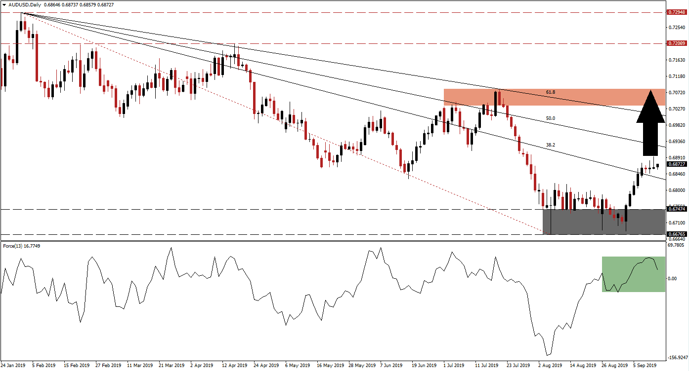 Forex traders should closely watch the Force Index as it will give a clue of a retracement down to the 38.2 Fibonacci Retracement Fan Support Level will lead to more upside in the AUD/USD or if a breakdown will result in a full retracement back down to its support zone. Barring any fundamental surprise, especially in regards to the US-China trade war, bullish momentum is expected to further increase. The most recent intra-day high of 0.68941 will hold the key to the next breakout in price action which will also elevated this currency pair past its 50.0 Fibonacci Retracement Fan Resistance Level and bring the AUD/USD one step close to its resistance zone.