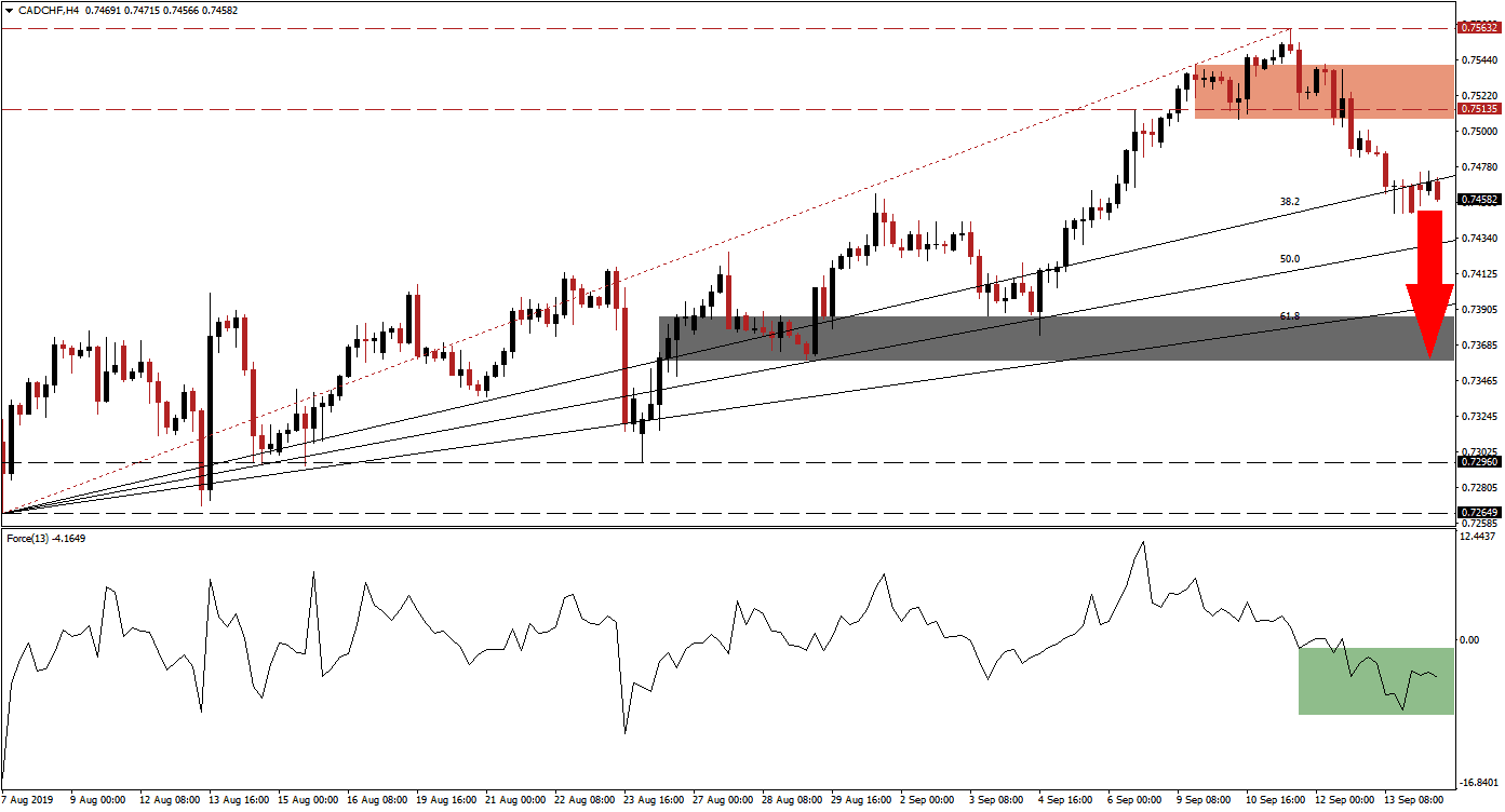As long as the Force Index remains loyal to its downtrend and maintains its positions below 0, the current sell-off should extend with a breakdown below its 50.0 Fibonacci Retracement Fan Support Level as well as below its 61.8 Fibonacci Retracement Fan Support Level. The latter is located just above its next support zone between 0.73594 and 0.73865, marked by the grey rectangle. A move below its current intra-day low of 0.74495 is likely to attract more net sell orders in the CAD/CHF which will push price closer to its support zone.