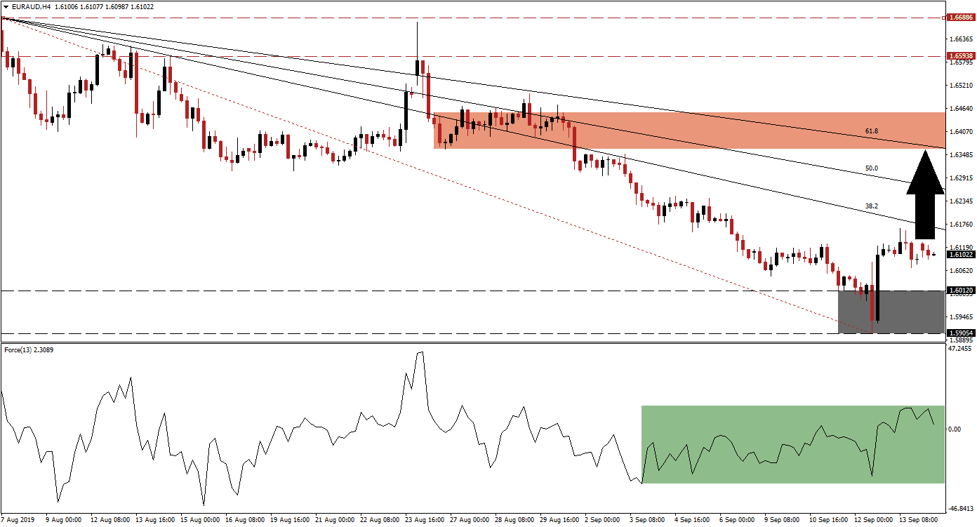 The EUR/AUD has completed a breakout above its support zone which is located between 1.59054 and 1.6012, marked by the grey rectangle in the chart. Price action advanced after the ECB announced the re-start of its quantitative easing program and after it delivered a 10 basis point interest rate cut in its deposit facility rate to -0.50%. This breakout has now ended the sell-off in the EUR/AUD and the 38.2 Fibonacci Retracement Fan Resistance Level is now the next level to monitor as it will dictate price action moving forward. The Australian Dollar remains vulnerable to Chinese economic data which this morning showed a weaker than expected reading in industrial production as well as in retail sales.