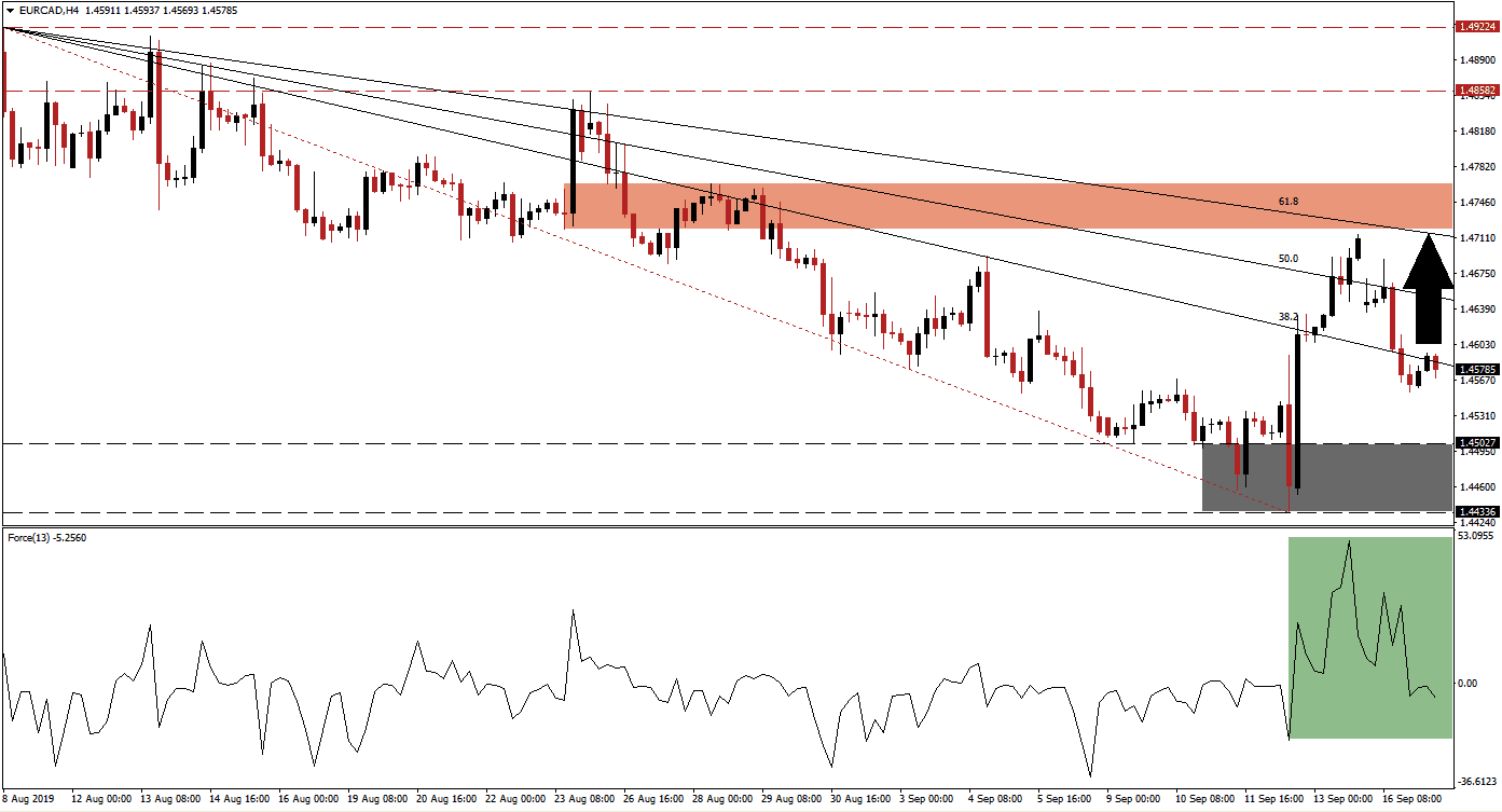 After the ECB press conference last week, where the ECB announced that its open ended bond buying program will resume on November 1st 2019 at a rate of €20 billion per month and the deposit facility rate was cut by 10 basis points to -0.50%, the Euro rallied across the board. This took the EUR/CAD from its intra-day low of 1.44336, the bottom range of its support zone, to an intra-day high of 1.47135, close to its descending 61.8 Fibonacci Retracement Fan Resistance Level and the bottom range of its resistance zone which is located at 1.47190. A sell-off followed which took price action below its 38.2 Fibonacci Retracement Fan Resistance Level where this currency pair is trading now.