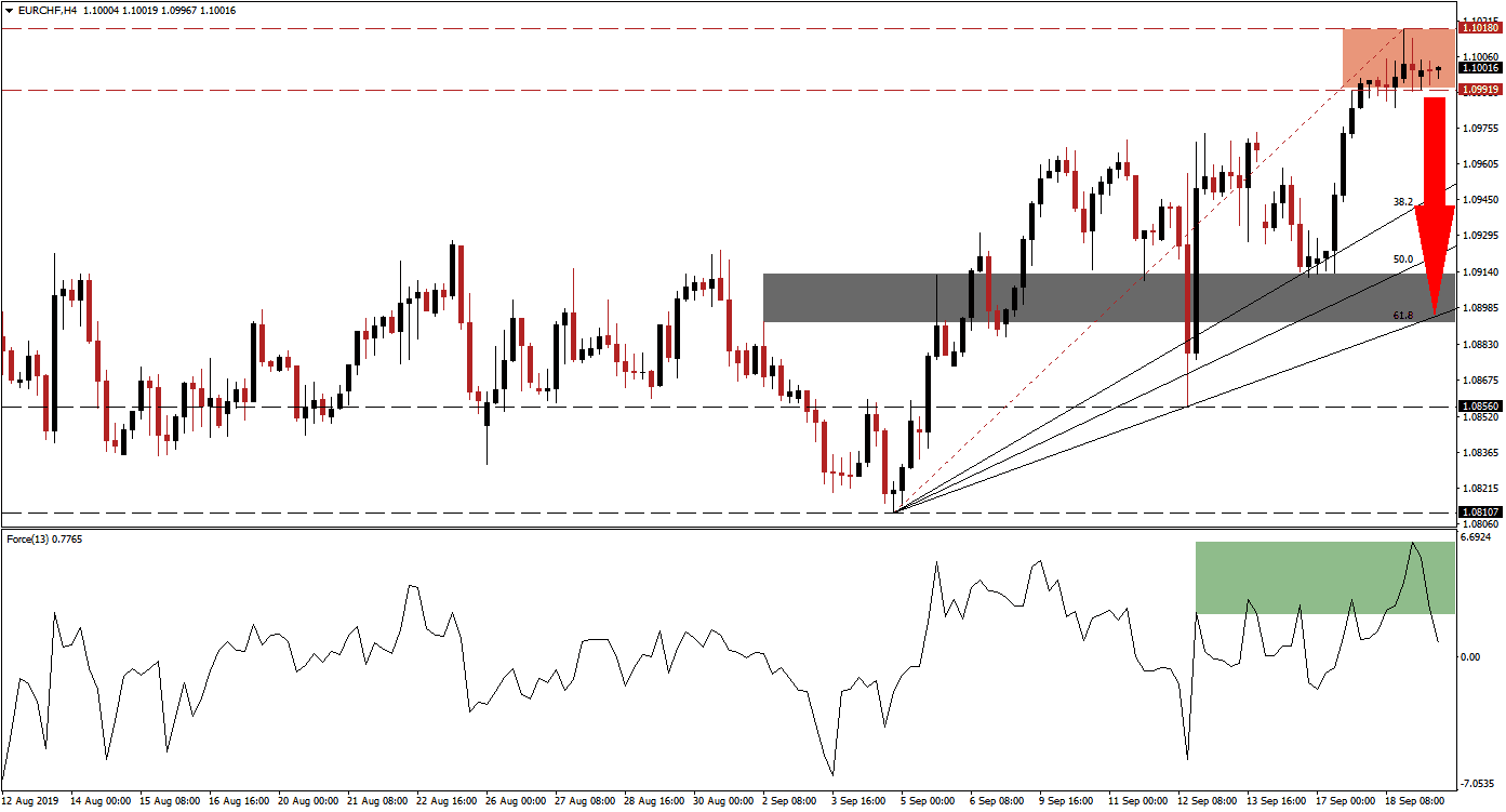 The Force Index, a next generation technical indicator, confirmed the most recent intra-day high of 1.10180 with a fresh peak of its own. Following the confirmation and as price action started to trend sideways inside of its resistance zone, the Force Index collapsed which is marked by the green rectangle. Bullish momentum is fading quickly and this technical indicator is now racing towards its center line set at 0. A move below 0 will place bears in control of price action and is expected to precede a breakdown in the EUR/CHF.