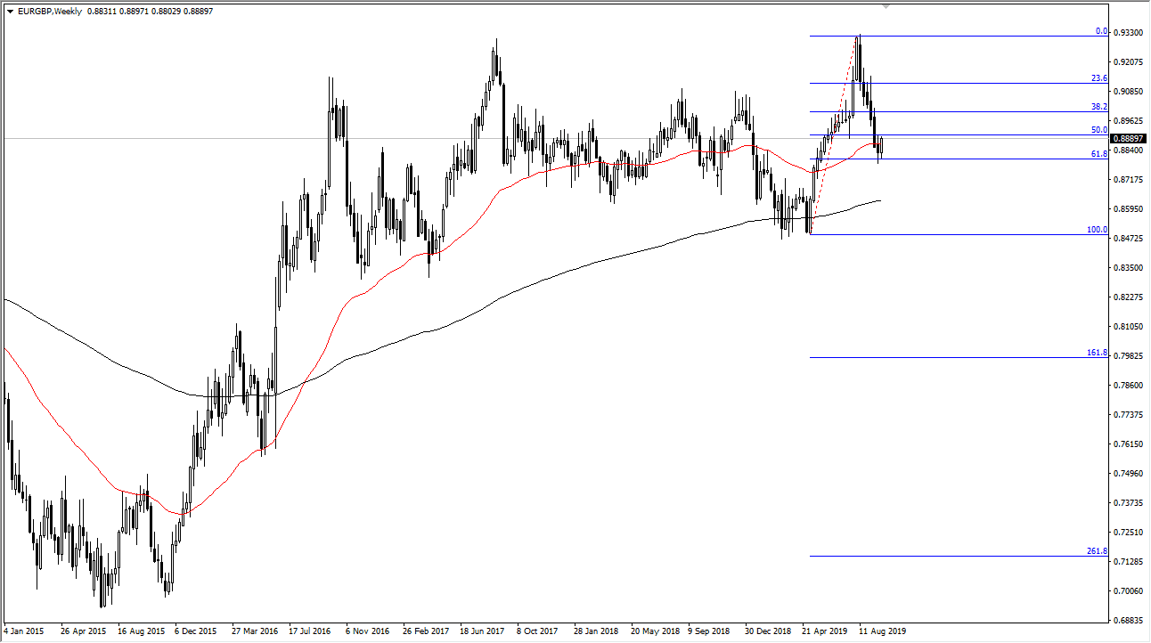 The technical analysis is interesting because we are testing the 50 week EMA but have also seen a bit of support at the 0.88 handle which is also the 61.8% Fibonacci retracement level. Simply put, if we can break above the highs of the last two weeks of the month, then I think the market goes looking towards the 0.90 level at the very least, as it is a large, round, psychologically significant figure and previous resistance from earlier in the year. If we can break above there, then we will more than likely test the highs again.