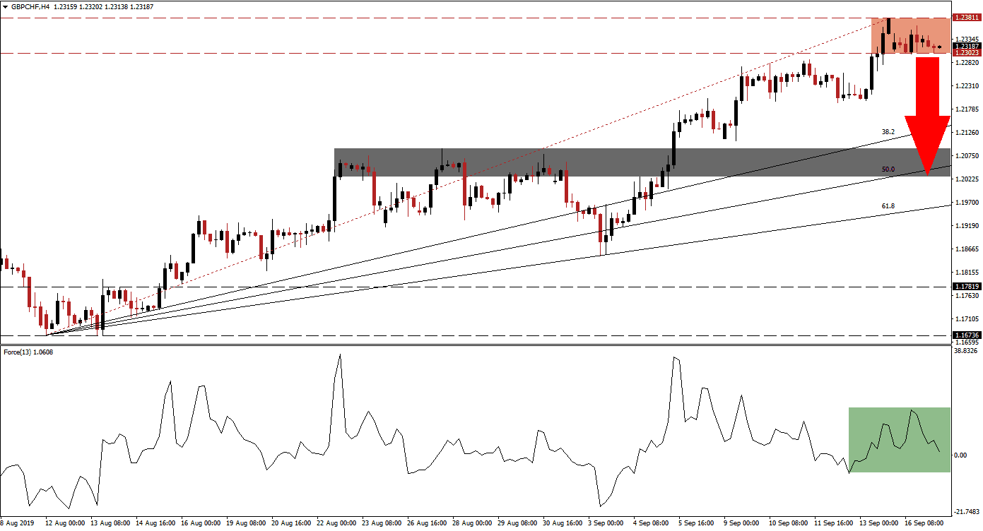 With Brexit developments very dynamic and the October 31st 2019 deadline approaching, the GBP/CHF is vulnerable to unexpected developments which have a grave impact on price action. While bullish momentum is fading, if the Force Index fails to sustain a move below the 0 center line and a positive development in regards to Brexit will be circulated, a breakout could be the result. This may lift price action to the bottom range of its next resistance zone which is located at 1.24966, but a breakout remains unlikely without a fundamental catalyst in current technical conditions.