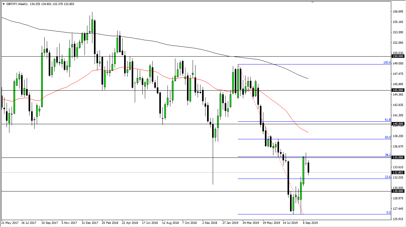 The British pound has been all over the place during the last several months, initially reaching to the ¥135 level before rolling over a bit. In fact, on the weekly chart, you can see that there was a shooting star right at that level after the drone strike in Saudi Arabia. That of course is a major “risk off” event, and it makes quite a bit of sense that there was a gap that kicked off the week, but then the market turned around to fill that gap before rolling over again to form that very bearish candle stick.