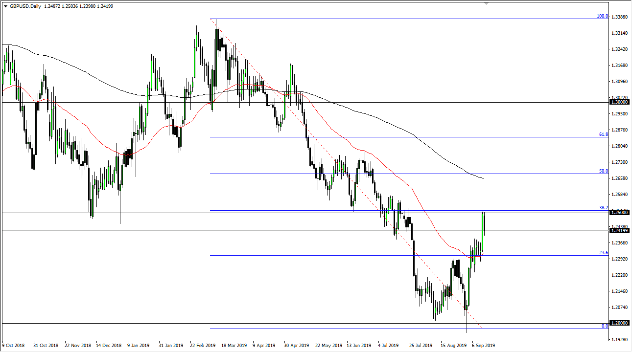 The US dollar has strengthened due to the insecurity around the world, especially considering the drone strike in Saudi Arabia. Treasuries do get a bit of a bid, and that of course drives up the demand for the US dollar. As soon as we get negative headlines involving the Brexit again, that will send the British pound right back down as well. There is a lot of noise just above, so it is going to be difficult to continue to go to the upside without some type of major catalyst. We have gone parabolic, we are running into resistance, and starting to react to it again. Looking at the chart, the fact that we have been this parabolic as of late, that tells me that there was probably a lot of short covering going on out there, so having said that there may not be any real momentum underneath the move that could continue to push this market higher for the longer-term as there is so much in the way of negativity.