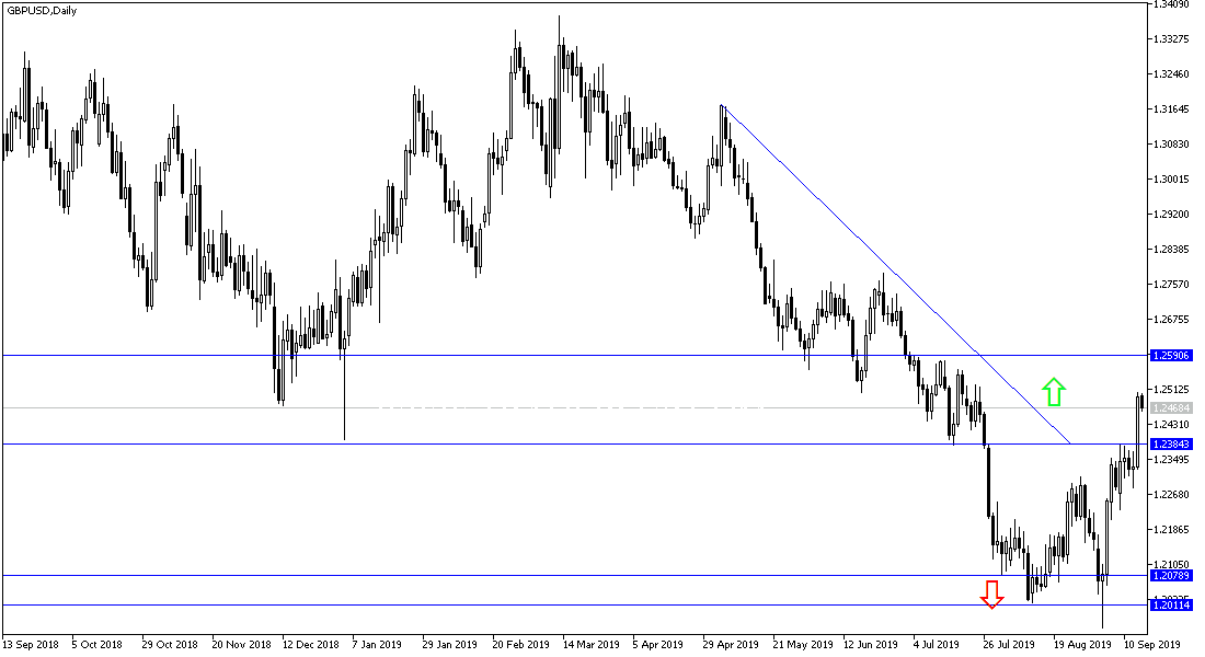 By the end of last week, the GBP/USD pair rebounded strongly, reaching the 1.2505 resistance level, its highest in seven weeks, supported by the decline of the US dollar. The recent optimism about the possibility of reaching an agreement between the EU and Britain to avoid a hard Brexit that will negatively affect both sides, before settling around 1.2465 at the time of writing. All indications from the British government, despite the political conflict between them and the opposition, confirm that Johnson is determined to remove the deliver Brexit by the October 31 deadline. The government's stance awaits a response from the EU. Reports of a meeting between Prime Minister Boris Johnson and European Commission President Jean-Claude Juncker could keep the positive mood in place until Monday, but there is still some suspicion that it will last much longer.