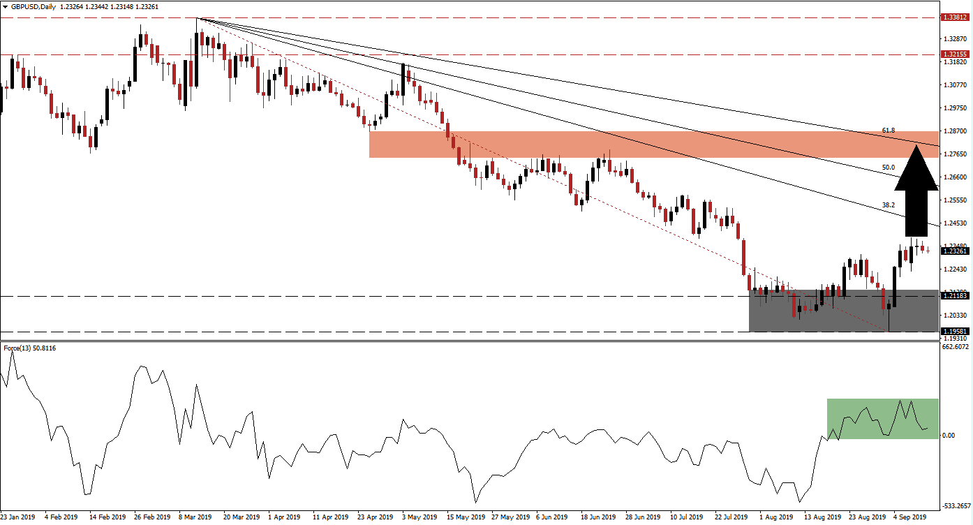 A successful breakout above the 38.2 Fibonacci Retracement Fan Resistance Level, confirmed by the Force Index, opens the way to the upside into its 61.8 Fibonacci Retracement Fan Resistance Level which is currently located inside of the 1.27450 to 1.28655 resistance zone, marked by the red rectangle. The increase in bullish momentum for the British Pound due to most recent Brexit developments coupled with the expected interest rate cut by the US Fed has created a fundamental scenario which favors an extension of the breakout.