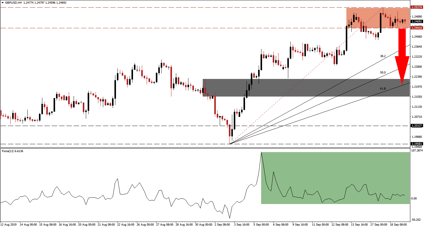 As the Force Index is approaching its center line set at 0, the GBP/USD is expected to initiate a breakdown below its resistance zone which is located between 1.24410 and 1.25274; marked by the red rectangle. This should take price action down to its 38.2 Fibonacci Retracement Fan Support Level from where the Force Index needs to confirm the breakdown in order to extend it further to the downside. Profit taking following the sharp rally in the GBP/USD is likely to contribute to the selling pressure which is building in this currency pair.
