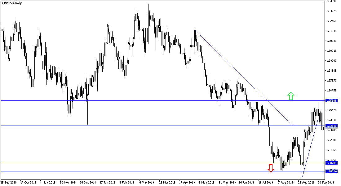 Recent hopes for a smooth Brexit outlook evaporated, and the GBP / USD pair lost most of its recent gains. Yesterday's session plunged from the 1.2500 resistance level, which was boosting the pair's strength, to the 1.2347 support, the lowest level in two weeks, amid the worst daily performance for the pair since the beginning of this month's trading. The strength of the US dollar, coupled with British political tensions after the reinstatement of the British Parliament bu the ruling of the country's Supreme Court, which saw Boris Johnson's decision as invalid and illegal, contributed to the pair's losses. The heated confrontation between Johnson and the opposition made him say that the House of Commons should step aside and let the government take care of Brexit as per the will of the people, or work to isolate him from his post.
