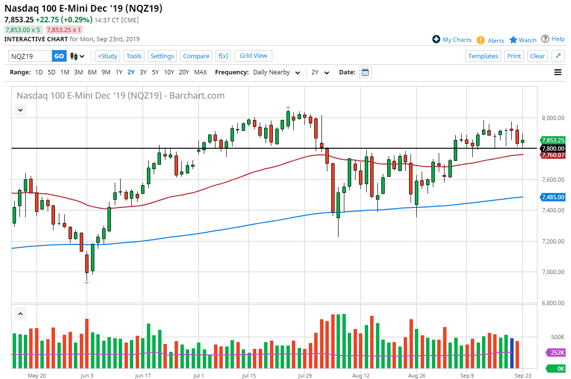 The NASDAQ 100 has gone back and forth during the trading session on Monday, showing signs of volatility yet again. Ultimately, the 7800 level seems to be very important, and as a result it’s likely that the market continues to find buyers underneath, as the large, round, psychologically significant number typically does. Beyond that, we also have the 50 day EMA just below that could offer plenty of support as well.