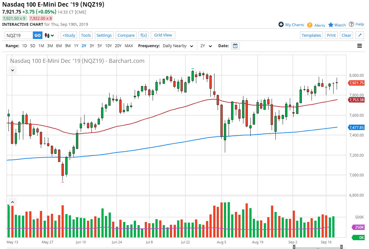 The week has been very flat, and in and of itself could be thought of as a small victory for the trend, but not impressively so considering that the Federal Reserve has just cut interest rates and even suggested that they could again, while equities did very little. In other words, it seems as if the market is just as confused as it was last week, and it needs to figure out whether or not it has the momentum to break out. Based upon the consolidation underneath, the target was to be the 8200 level but obviously the 8000 level needs to be put in the rearview mirror for the market to be able to do so. If we were to break down, I would expect plenty of areas, roughly every 100 points or so, to offer support that could be taken advantage of. Again though, the smart money is staying out of the market during the trading session as flows to defend options strike prices will continue to drive the market back and forth.