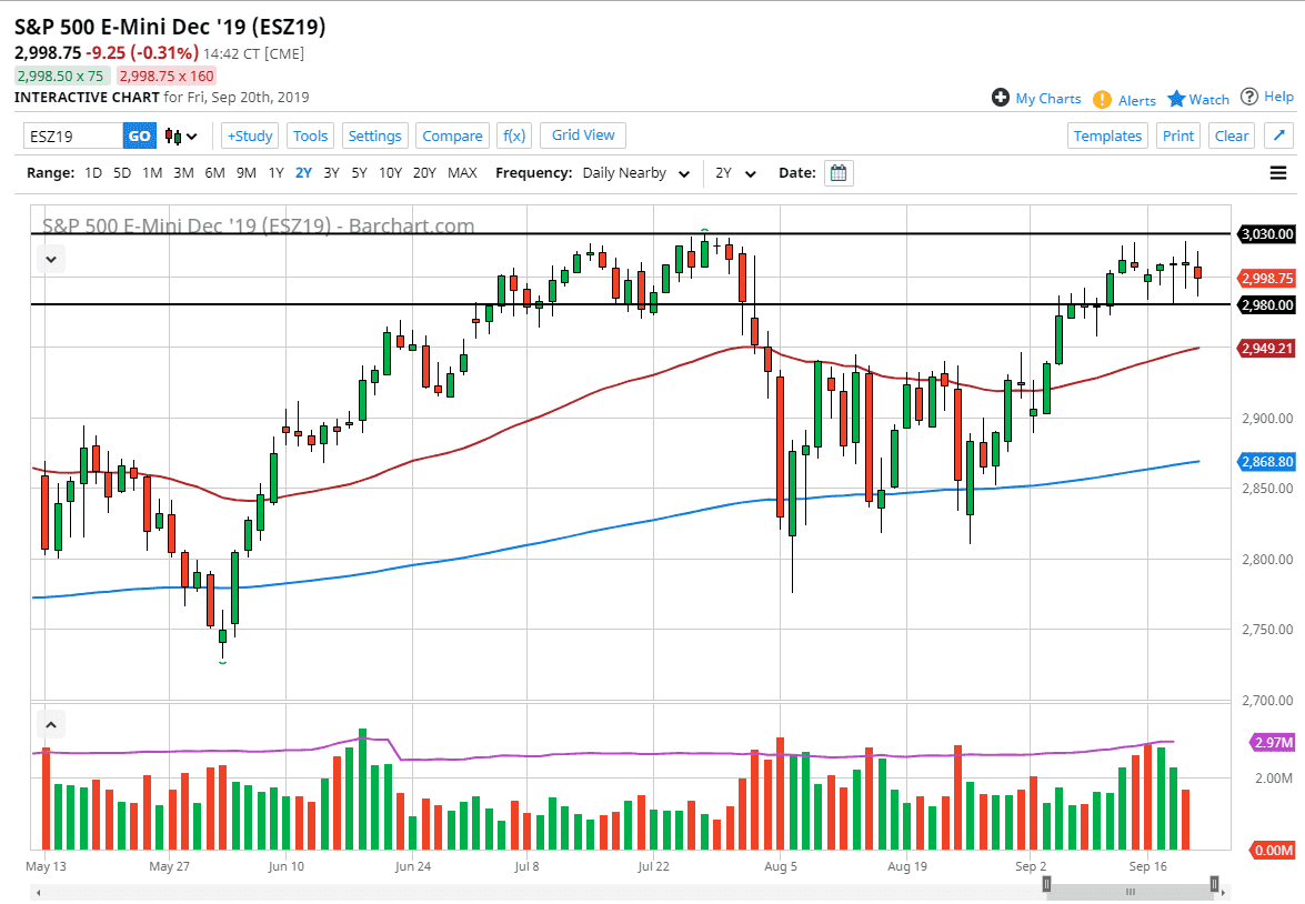 The S&P 500 has gone back and forth during what is known as “quadruple witching” on Friday, which is the expiration of four different types of options. This causes a lot of issues, so therefore it’s not a huge surprise to see the market unable to go anywhere. When you look at the overall week, there wasn’t much going on. This is a market that is currently stuck at this point, so it’s likely that the markets need some type of catalyst to go in one direction or the other. However, there is a couple of well-defined levels that we can pay attention to in order to take advantage of a particular move.