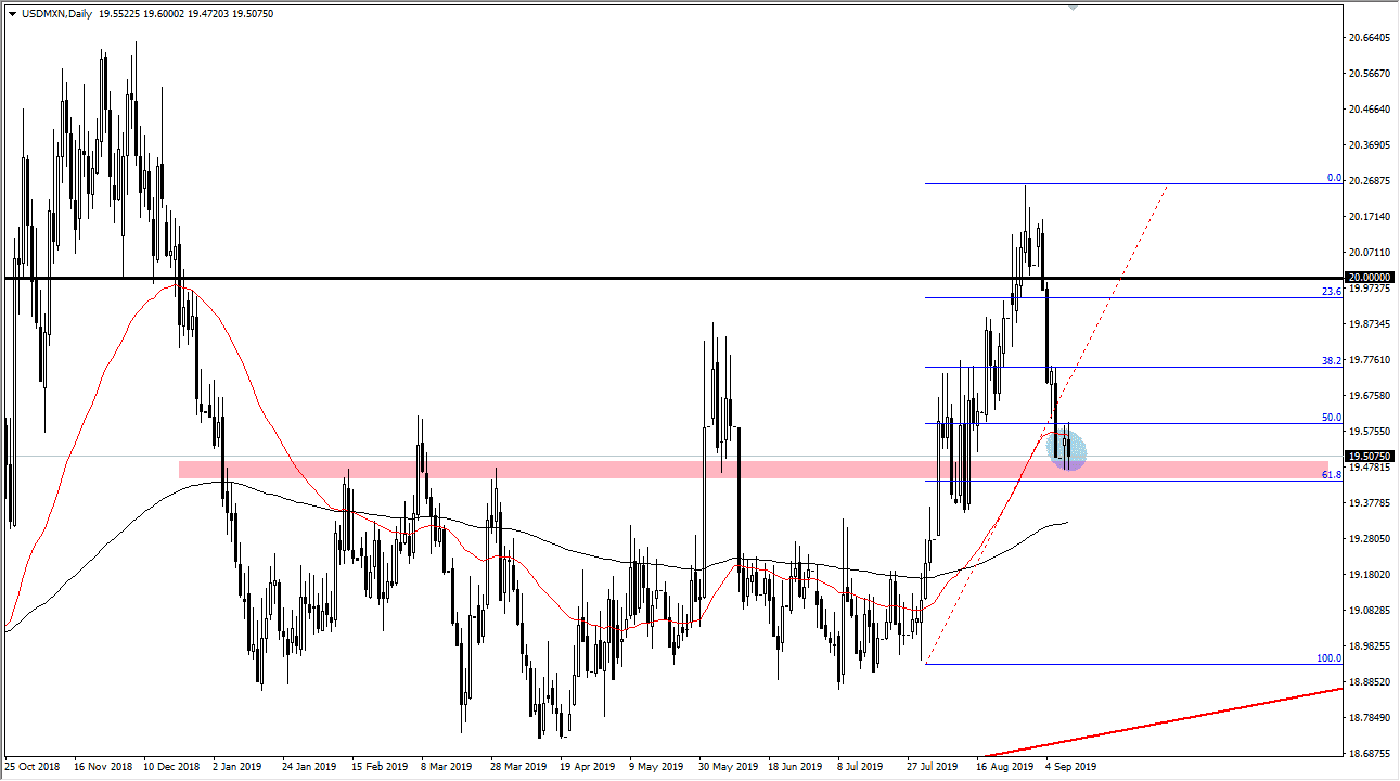 Beyond that, you should also keep in mind that the market favors the US dollar in times of financial uncertainty, and that of course is what we have going on now. The Mexican peso represents emerging markets, and that can’t be ignored. This is a market that is going to have to make some type of decision in this region, as we are just below the 50 day EMA but well above the 200 day EMA. If we can turn around and break above the 19.60 pesos level, then it’s likely that we will continue the move to the upside, perhaps reaching towards the 20.00 pesos level next.