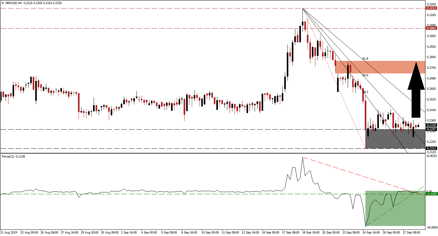 Any move in price action below its support zone is unlikely to be sustained as the fundamental picture points towards an extremely oversold XRP/USD. The Force Index should be closely monitored together with the intra-day low of 0.2153, the bottom of the current support zone. The next short-term support level is located between 0.1905 and 0.1972.