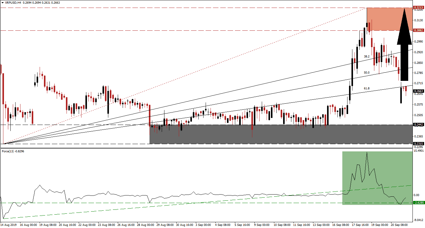 Following the breakdown below its 61.8 Fibonacci Retracement Fan Support Level, which tuned it into resistance, a higher low of 0.2583 formed and XRP/USD advanced back into its new resistance level. A retracement following the breakdown below a key support level is normal and the Force Index should now be monitored in order to determine if a breakout is pending or if this cryptocurrency pair will descend further. A reversal of the current price spike can take XRP/USD back down into its support zone which is located between 0.2315 and 0.2442, marked by the grey rectangle. Volatility is expected to remain high as bulls and bears are fighting over the next move near key levels.