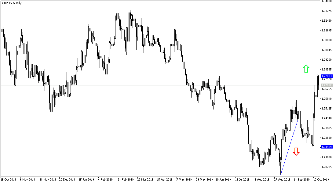 Continued optimism about the possibility of an agreement between the parties of the Brexit helped the GBP/USD pair to complete strong gains, which led the during Tuesday's session to test the 1.2798 resistance, a five-months high, before settling around 1.2746 at the time of writing. According to a report published by Bloomberg, the negotiators between the UK and the EU in Brussels are concluding the Brexit deal draft with optimism, and that there will be a breakthrough before the EU summit. EU and UK negotiators continue to seek a solution to the troublesome issue of Northern Ireland's borders.